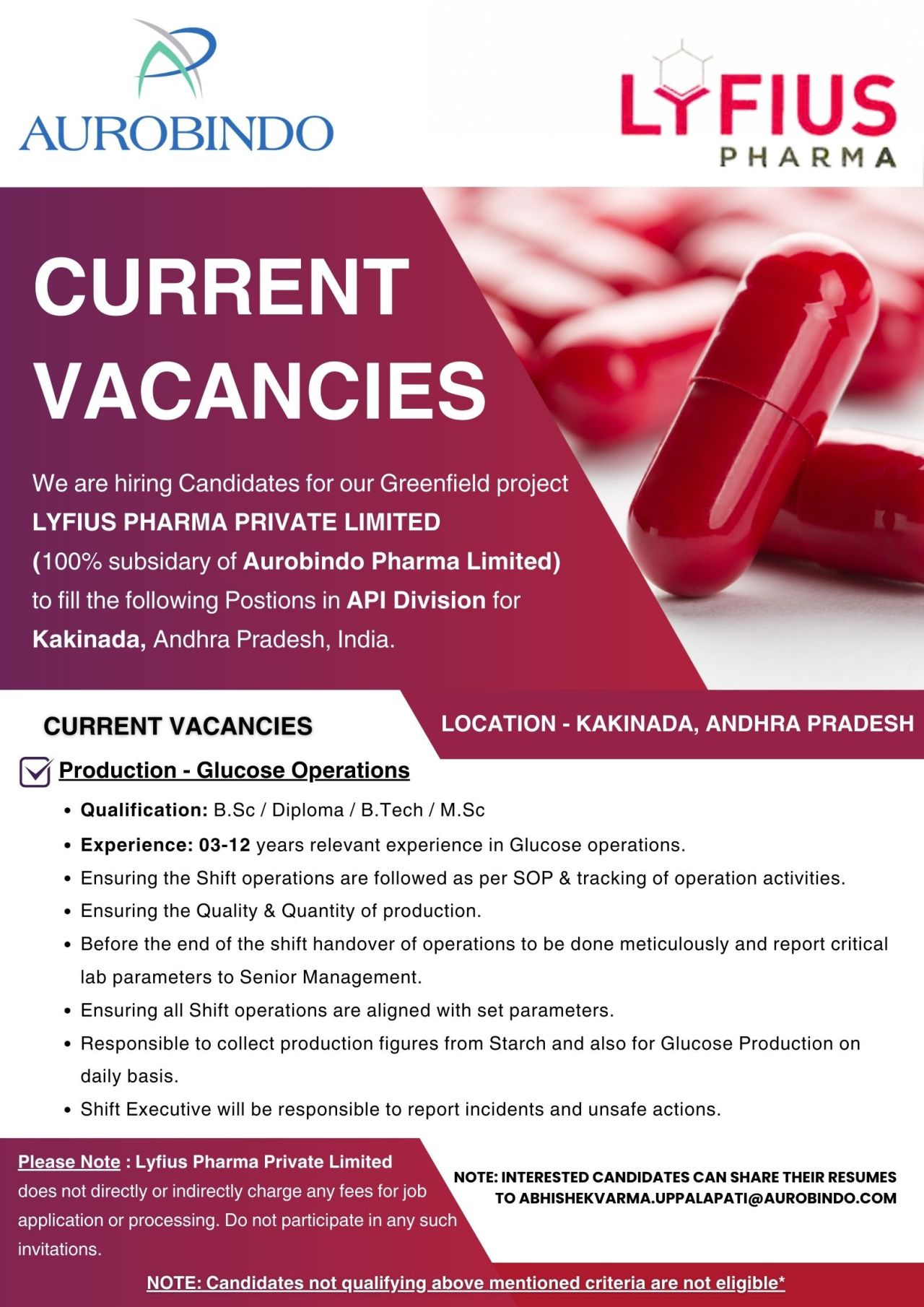 We are hiring Candidates for Lyfius / Qule Pharma Private Limited (100% subsidiary of Aurobindo Pharma Limited) to fill the following Position in API Division for Kakinada, Andhra Pradesh, India.