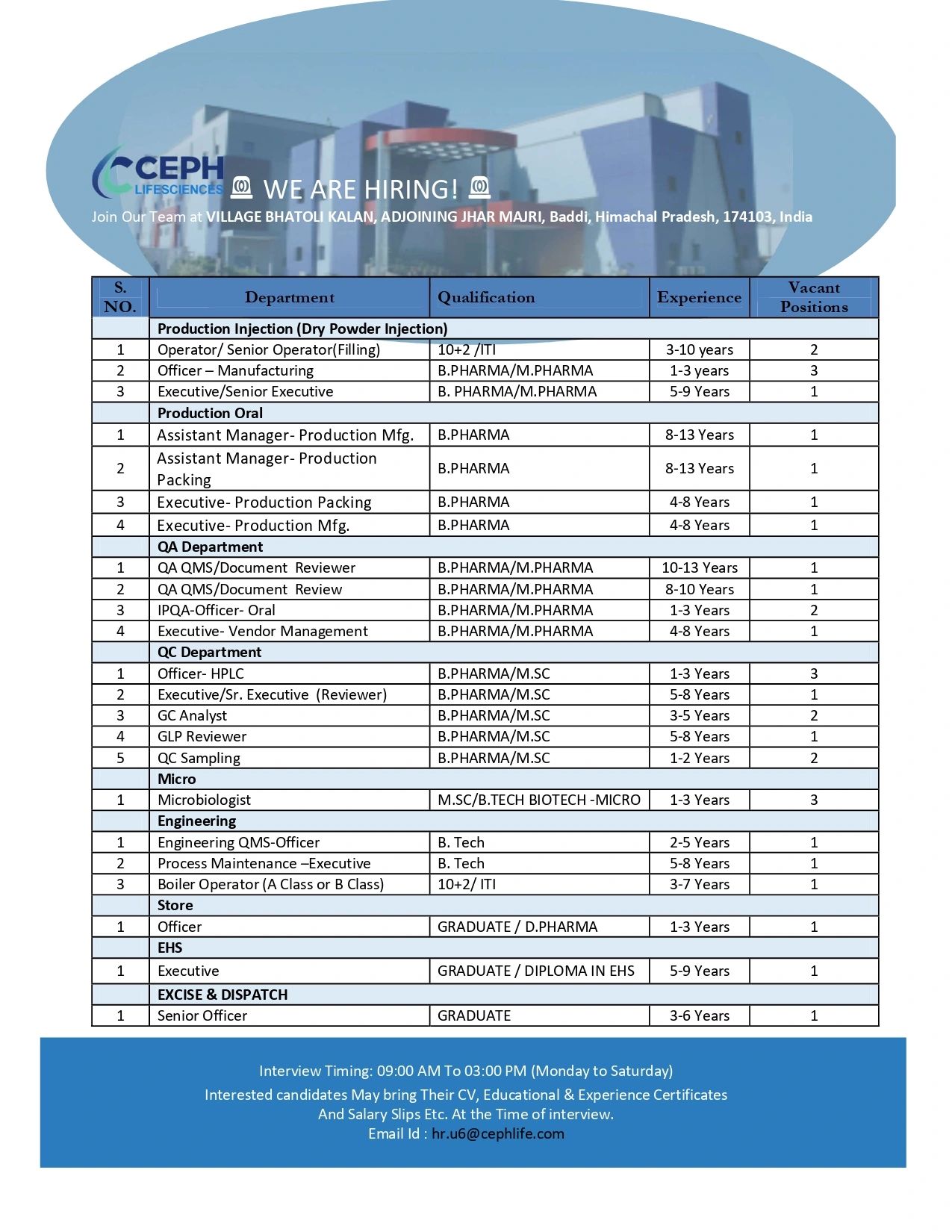 We Are Hiring at Ceph Lifesciences! Step into a rewarding career in the pharmaceutical industry and grow with a company that values talent, innovation, and excellence. πŸ’Ό Multiple openings in Production (Injection & Oral) πŸ“ Location: Baddi, Himachal Pradesh ✨ If you have the passion, skills, and experience β€” this is your chance to shine! πŸ“© Walk in with your CV or share it with us today. Don’t miss this opportunity to build your future with us!