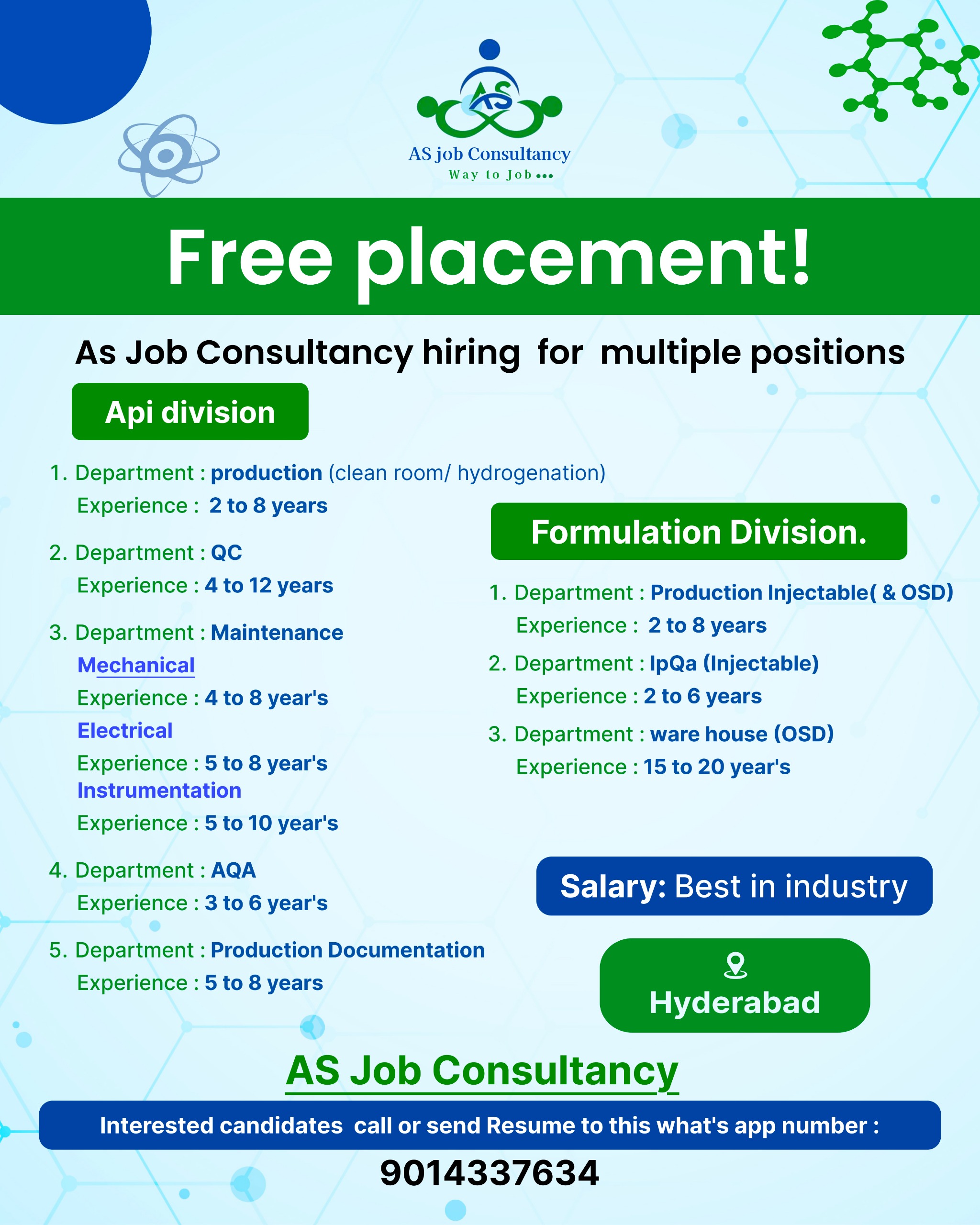 Free Placement Hiring AQA,QC,Production, Maintenance,IPQA,Warehouse