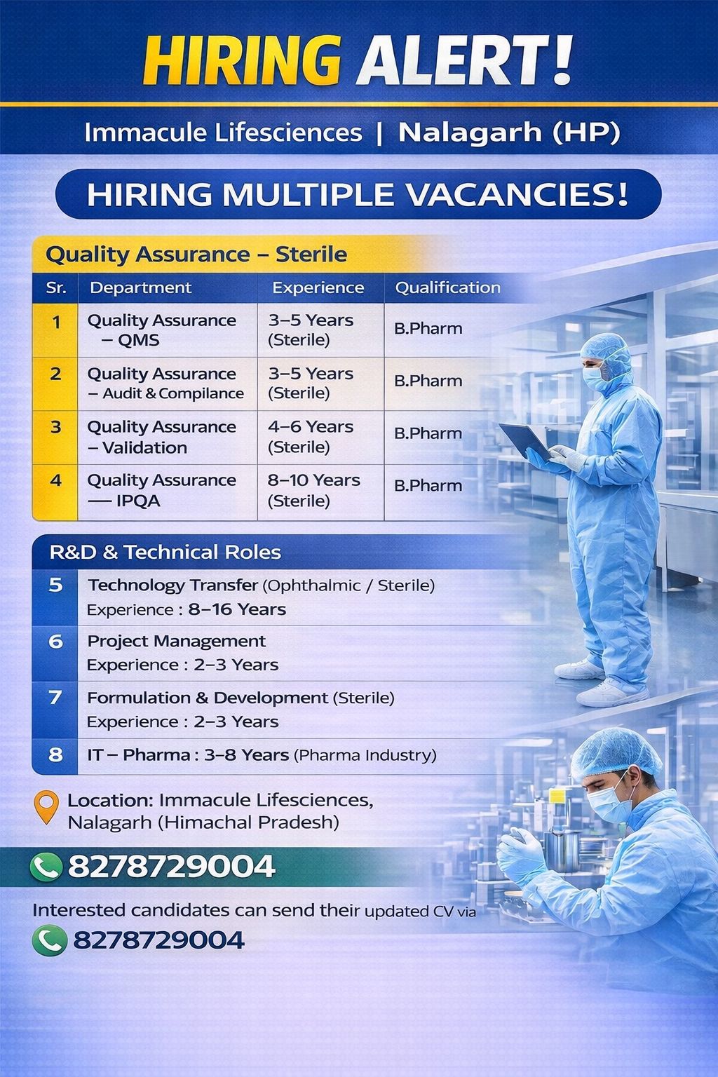 Only Pharma industry candidates with USFDA/ MHRA approved plant experience or relevant experience may apply.