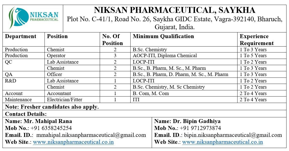 mmahipal.niksanpharmaceutical@gmail.com (Mr. Mahipal Rana: +91 6358245254)