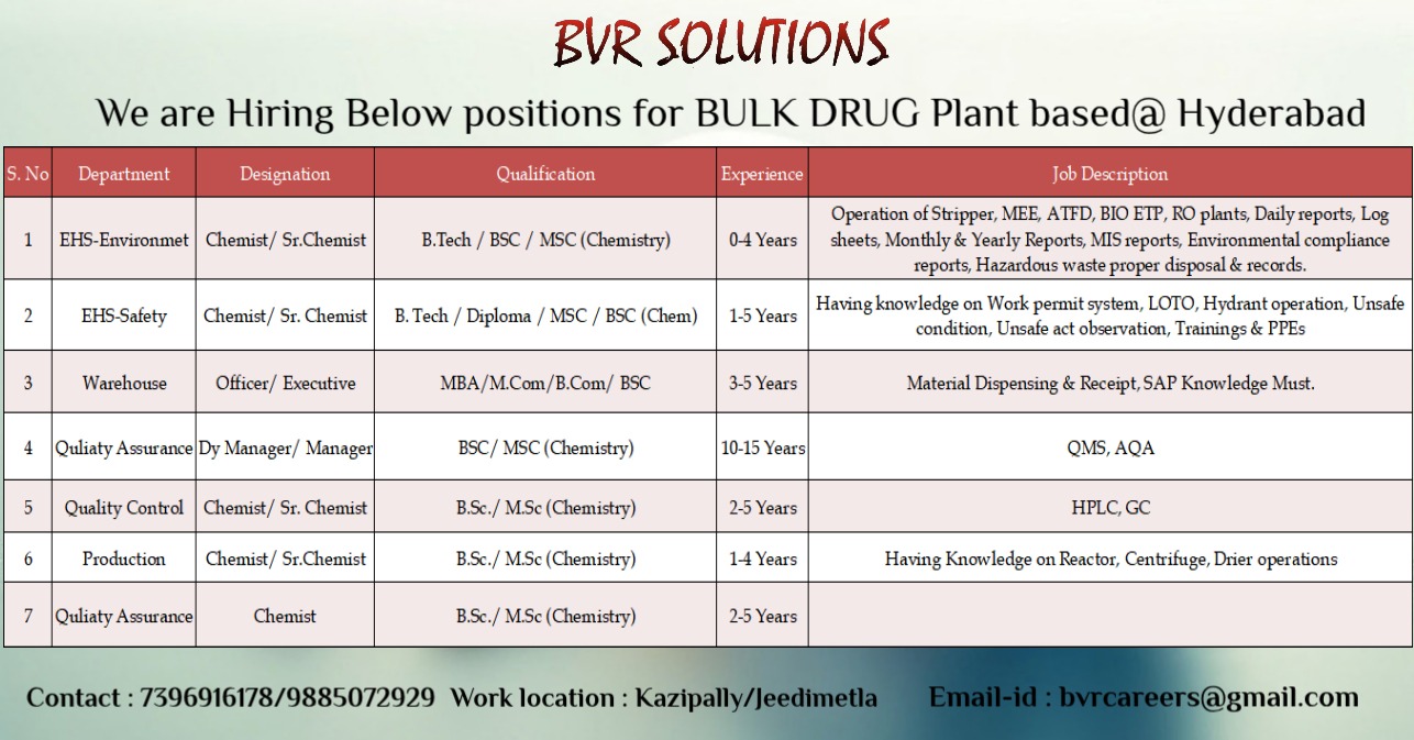 Post navigation Urgent Hiring Bsc,Msc,Bpharm,Mpharm for Production,PRD At Bulk Drug Plant In HyderabadFRESHER AND EXPERIENCED QA,QC,AR&D, FR&D,R&D,PRODUCTION,Microbiology,EHS,WEREHOUSE