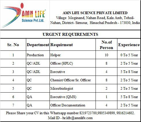 Urgent Recruitment for QA,QC,ADL,Production AT AMN Life Science Pvt. Ltd