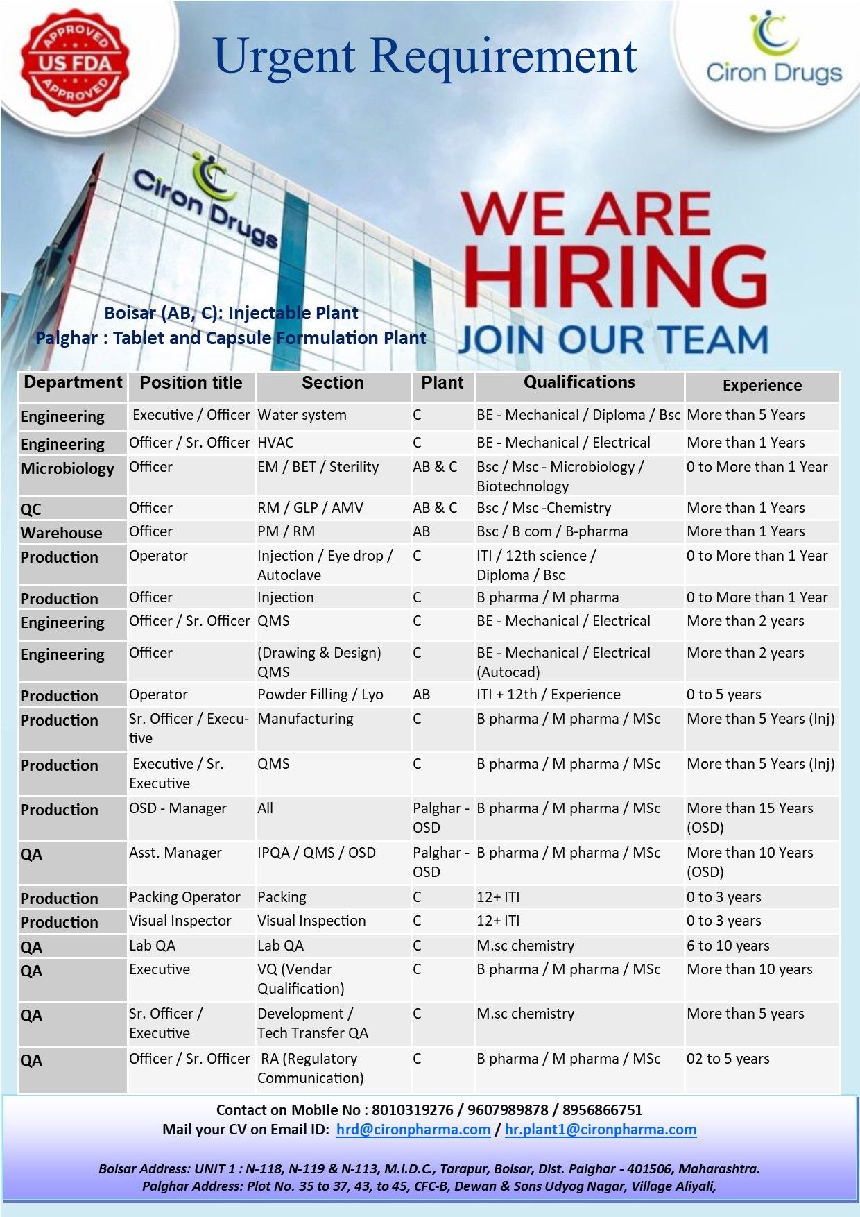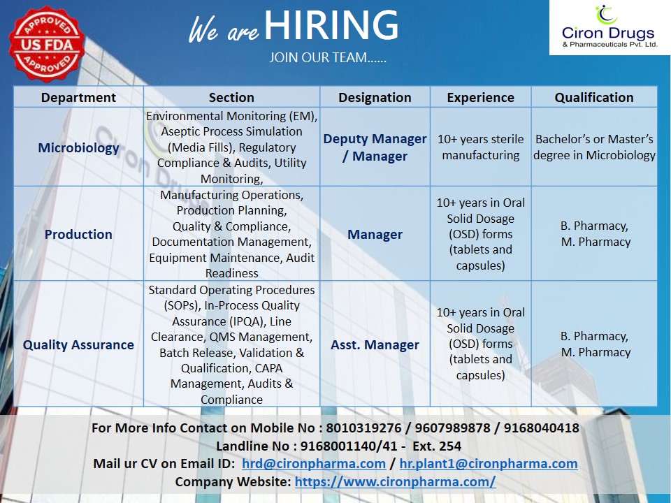 Urgent Recruitment Freshers & Experience for QA,QC,Production,Micro,warehouse, Engineering AT Ciron Drugs