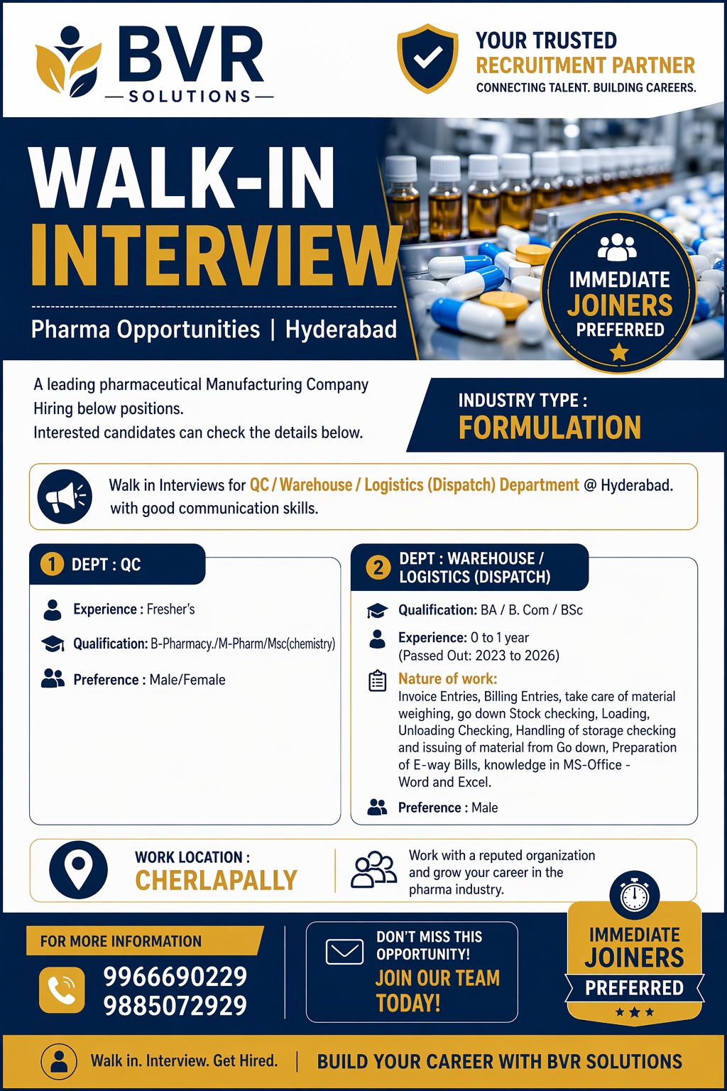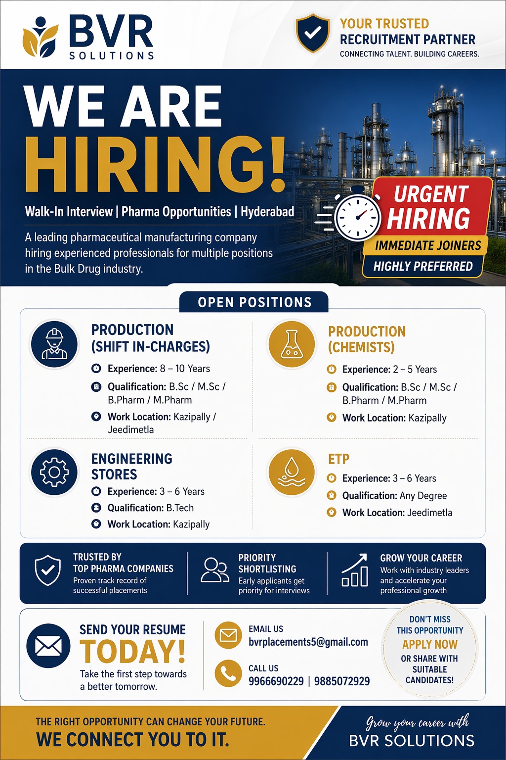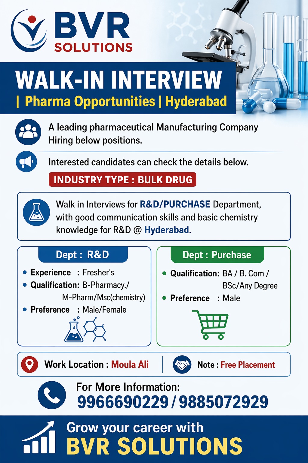 Post navigation Free Placement Freshers & experience for QC,Production, R&D,Maintenance,ARD,Packing,FRD,HR,AdminFreshers & Experience Urgent Recruitment for QA,QC,FR&D,RA,Production,Pharmacovigilance/Warehouse/Logistics
