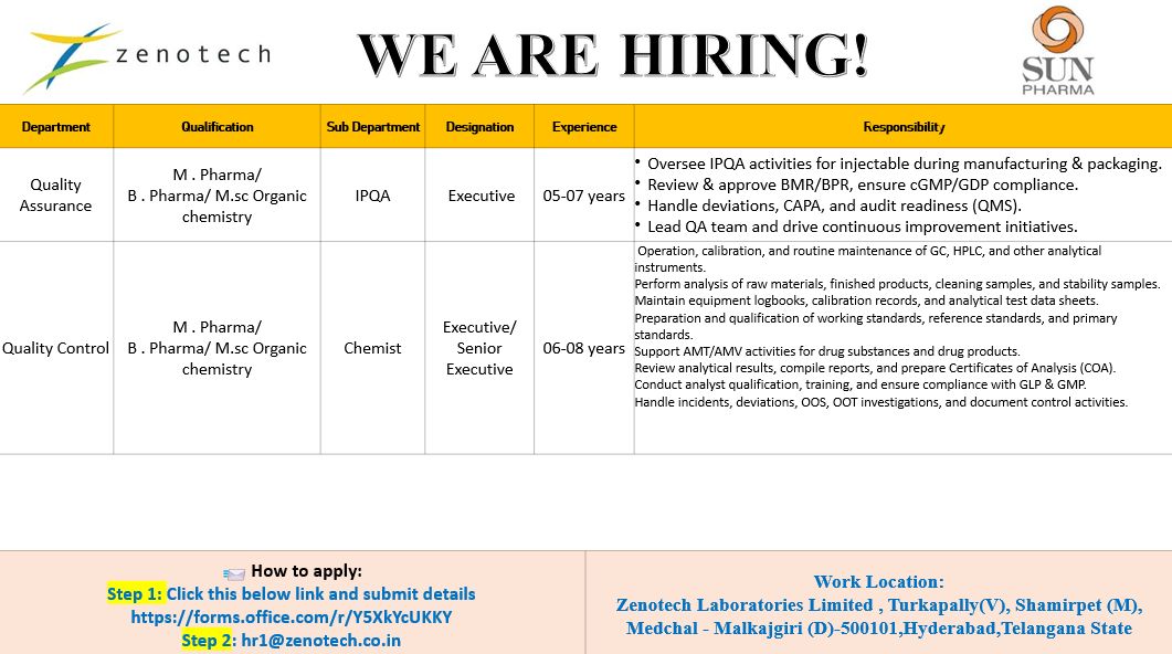 Zenotech Laboratories Limited (Hyderabad) (Subsidiary of SUN PHARMA) is looking for talented professionals to join the Quality Assurance/Quality Control Department